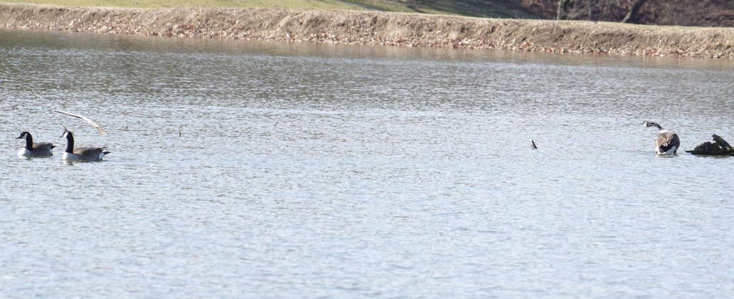 All was well until another goose couple appeared at the farther end of the pond. They were swimming quietly until noticing the pair on the log.