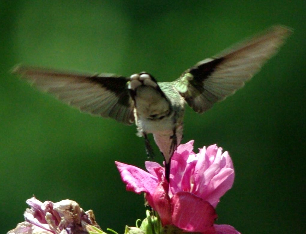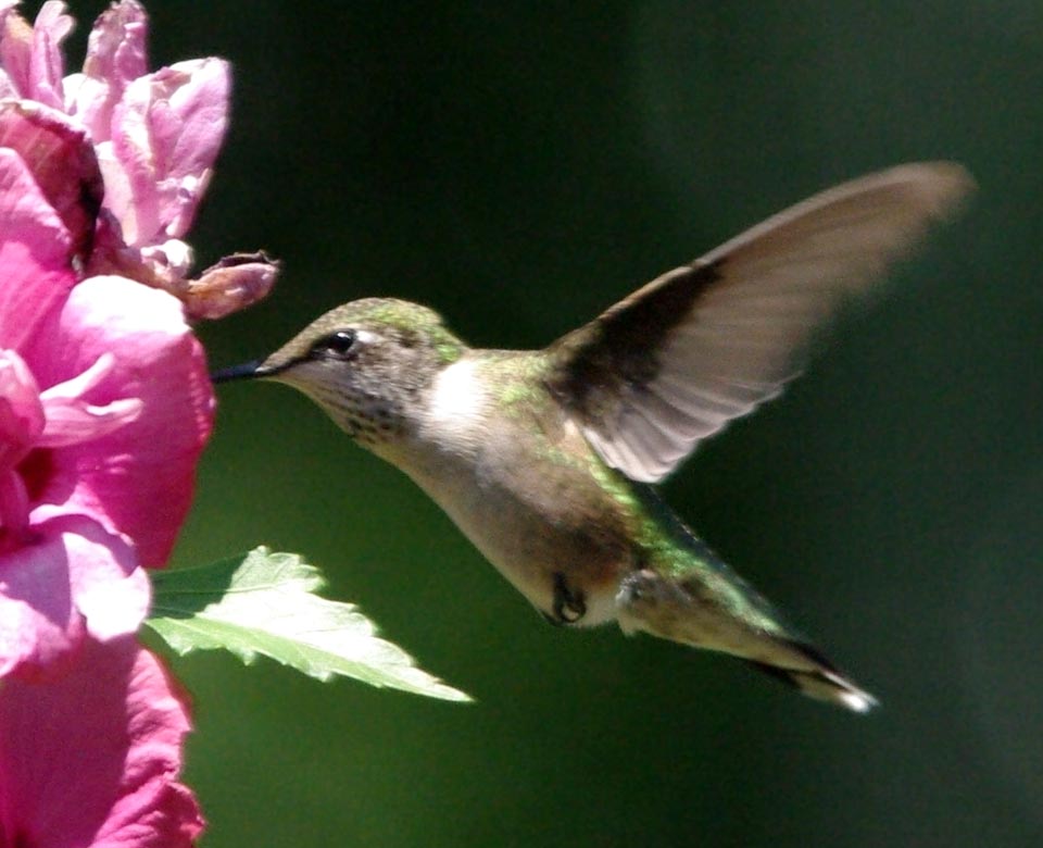 The blossoms from the rose of sharon are a hummingbird magnet. Following is a sequence of a female ruby-throated hummer planning to enjoy a little nectar. First, she sizes up her choice blossom.